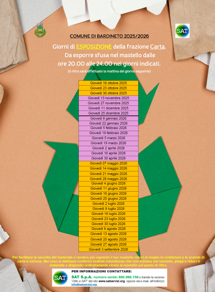 E’ disponibile il calendario per la raccolta della carta per il 2026 per gli utenti del Comune di Bardineto.