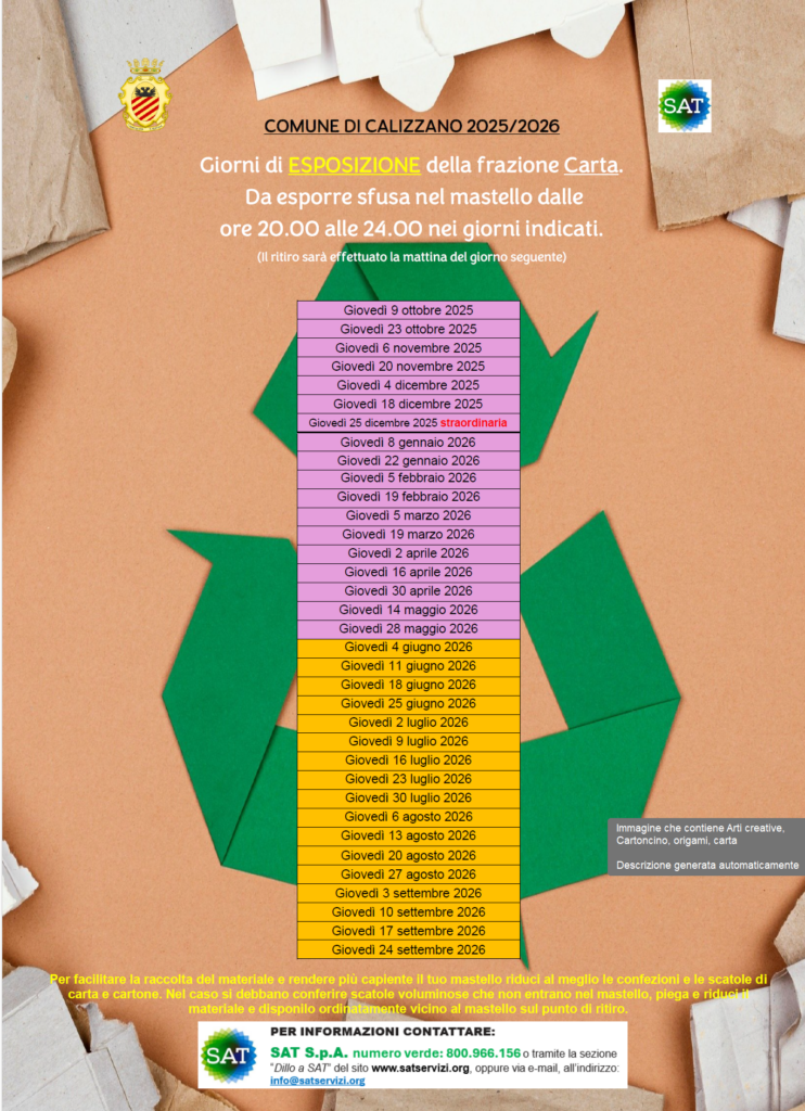 E’ disponibile il calendario per la raccolta della carta 2026 per gli utenti del Comune di Calizzano.