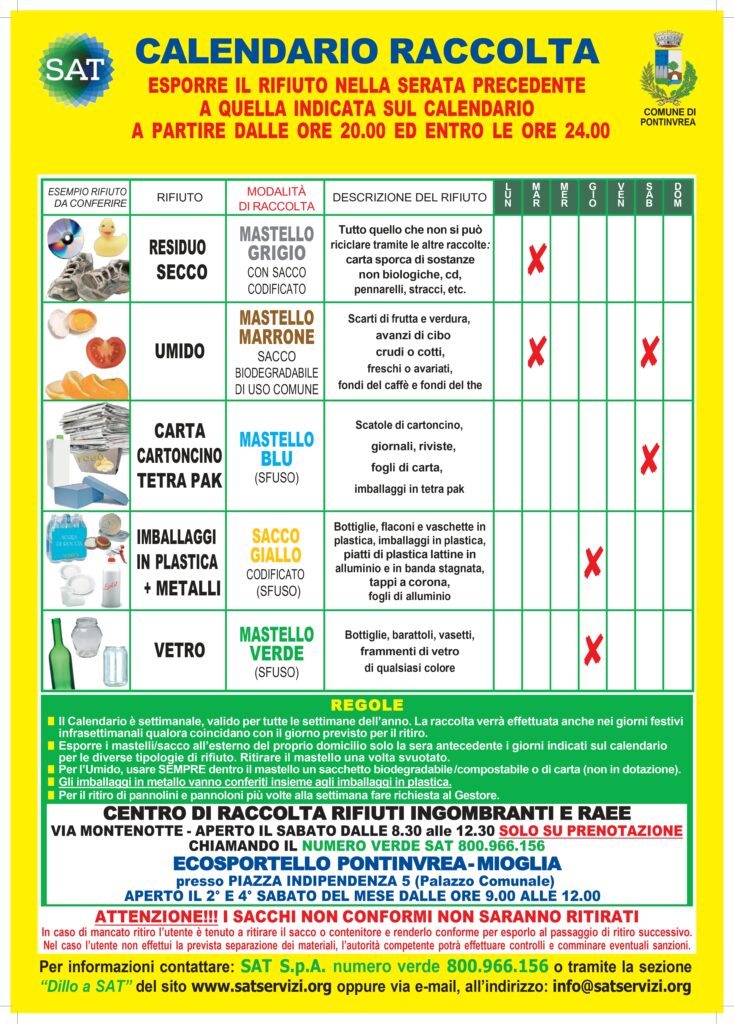 Da dopo domani, sabato 1 novembre 2025, sarà in vigore il nuovo calendario per la raccolta differenziata per le utenze di Pontinvrea che prevede l’esposizione la sera antecedente al giorno indicato nel calendario per il ritiro dei rifiuti attentamente differenziati nel contenitore corretto:
