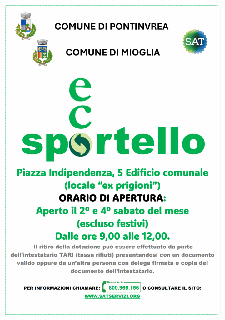 Dal 1° novembre 2025 gli utenti SAT di Pontinvrea e Mioglia avranno a disposizione un nuovo Ecosportello al quale rivolgersi per il ritiro del materiale per la raccolta differenziata.
