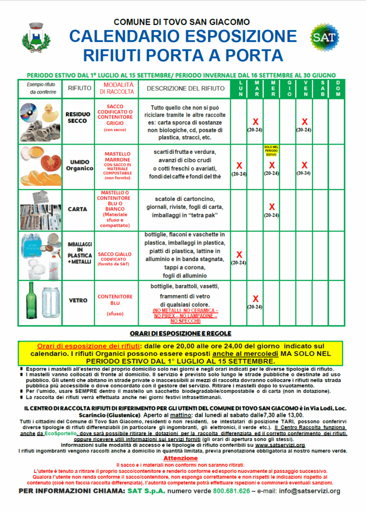 Scarica QUI il calendario della raccolta differenziata Si ricorda che il periodo estivo va dal 1° luglio al 15 settembre. Solo nel periodo estivo è possibile depositare l’umido organico anche il mercoledì tra le 20:00 e le 24:00.