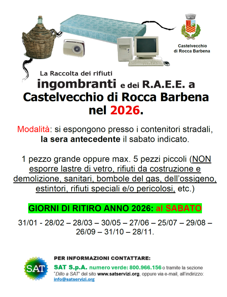 SAT ha pubblicato sulle rispettive pagine dedicate al Comune di Castelvecchio RB il nuovo calendario per le date di raccolta dei rifuti ingombranti per tutto il 2026. Prima data utile il 31 gennaio.