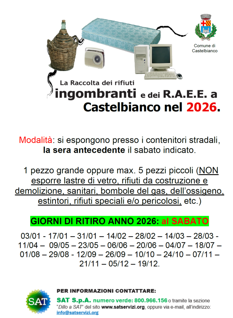 SAT ha pubblicato sulle rispettive pagine dedicate al Comune di Castelbianco il nuovo calendario per le date di raccolta dei rifuti ingombranti per tutto il 2026. Prime date utili il 3 e il 17 gennaio.