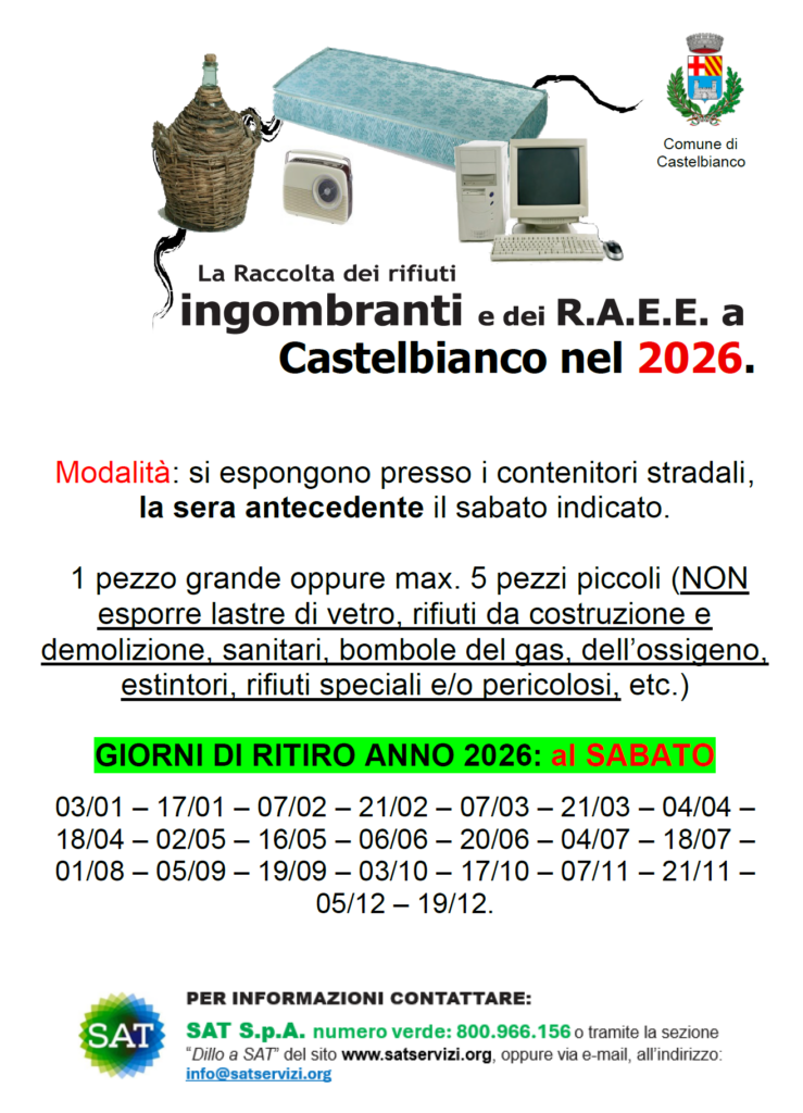 SAT ha pubblicato sulle rispettive pagine dedicate al Comune di Castelbianco il nuovo calendario per le date di raccolta dei rifuti ingombranti per tutto il 2026. Prime date utili il 3 e il 17 gennaio.