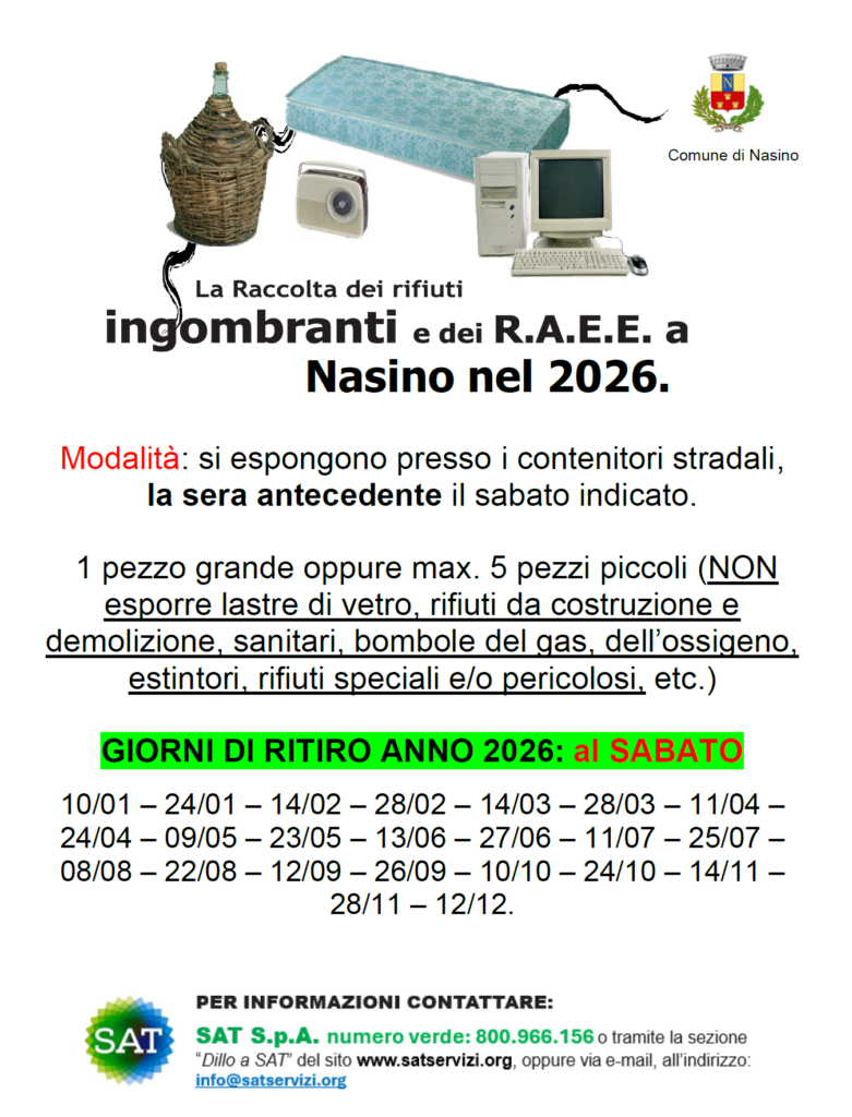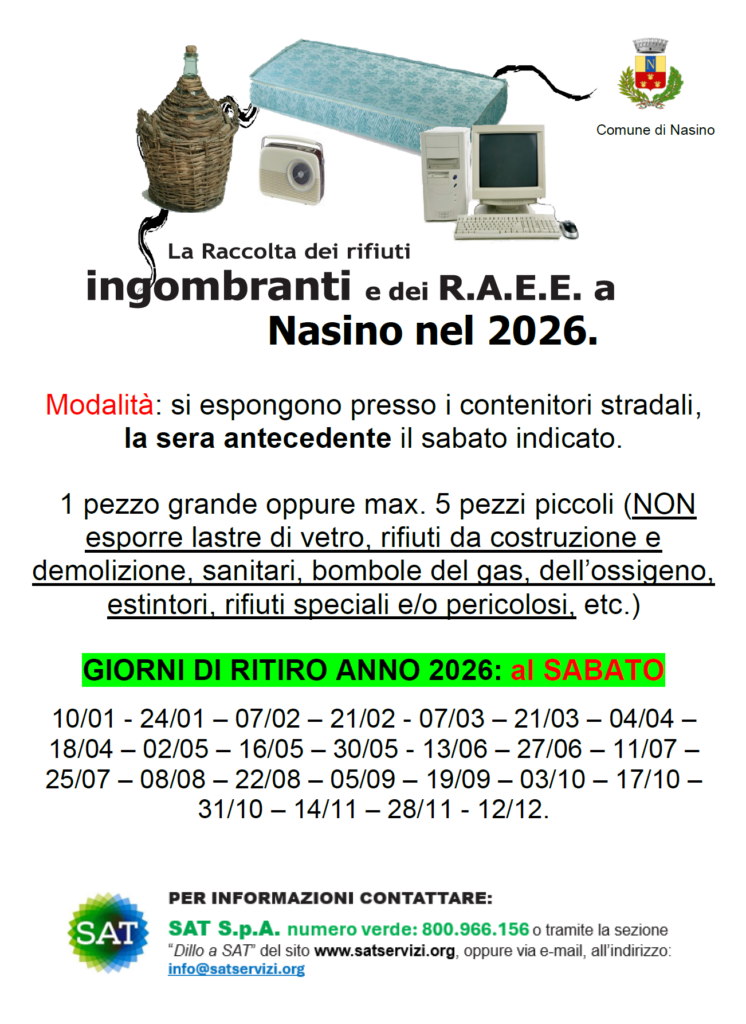 SAT ha pubblicato sulle rispettive pagine dedicate al Comune di Nasino il nuovo calendario per le date di raccolta dei rifuti ingombranti per tutto il 2026. Prime date utili il 10 e il 24 gennaio.